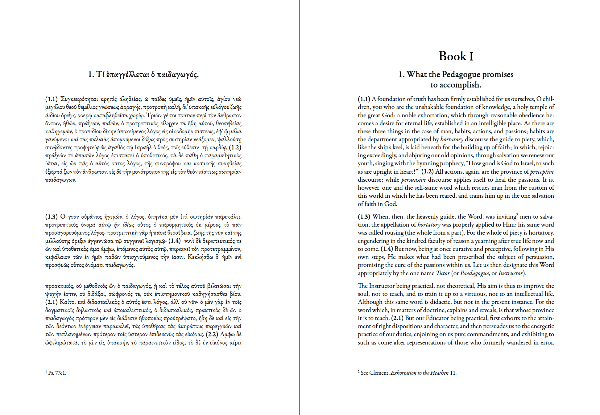 The English translation is the classic version by W. L. Alexander, valued for its fidelity to the Greek and clarity of expression, here presented alongside the modern critical Greek text. This bilingual format enables readers to study Clement’s nuanced ethical reasoning and distinctive theological vocabulary directly in the original language, while also remaining accessible to students and nonspecialists.