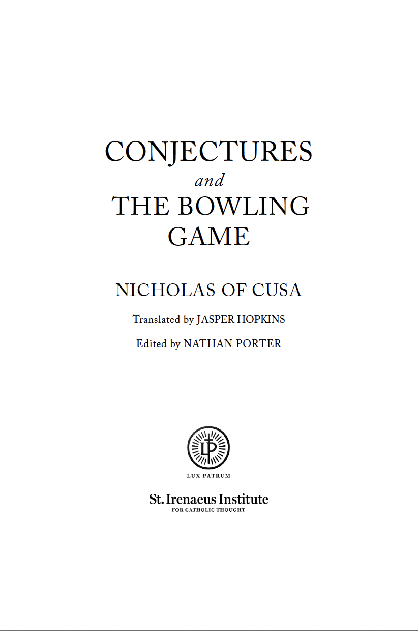 This volume includes presents Jasper Hopkins’ translations of Nicholas of Cusa’s Conjectures (De Coniecturis) and The Bowling Game (De Ludo Globi), along with the critical Latin texts by Koch, Bormann, and Senger.
