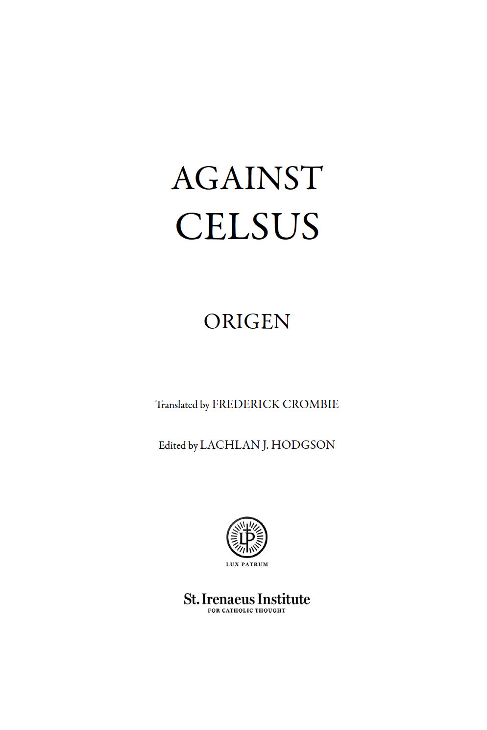 This Lux Patrum volume presents Origen of Alexandria’s Contra Celsum (Against Celsus), one of the most important works of early Christian apologetics, in a high-quality Greek–English facing-page edition. Written in the mid-third century in response to the pagan philosopher Celsus, Contra Celsum offers a sweeping defense of Christianity against charges of irrationality, novelty, and social subversion. The English translation is the classic version by Frederick Crombie, long valued for its accuracy and sobriety, here carefully revised and presented alongside the critical Greek text of Paul Koetschau. This bilingual format allows readers to engage Origen’s arguments directly in the original language while benefiting from a reliable and readable English rendering.